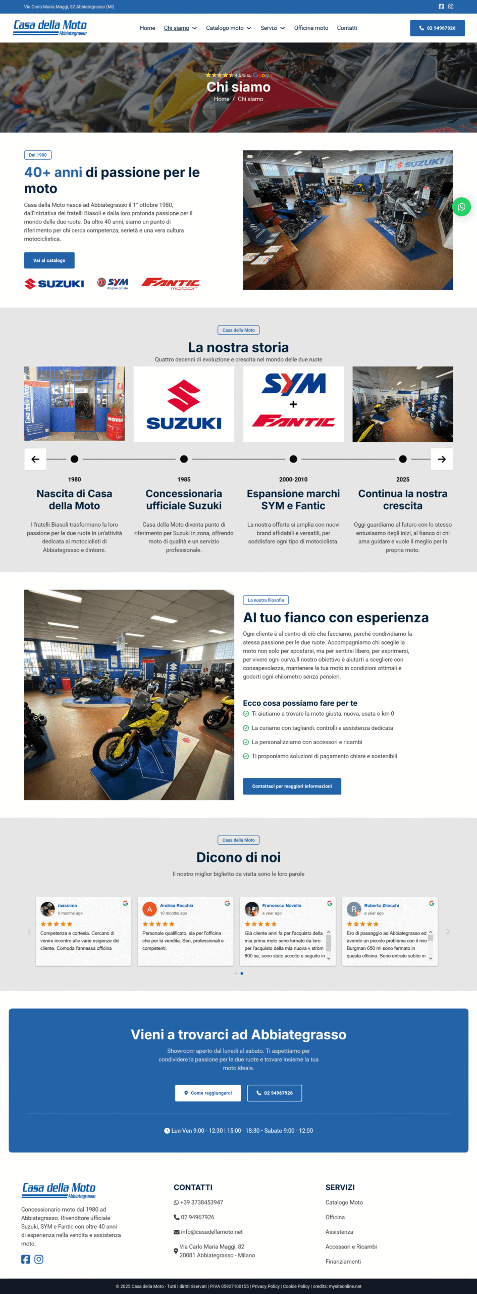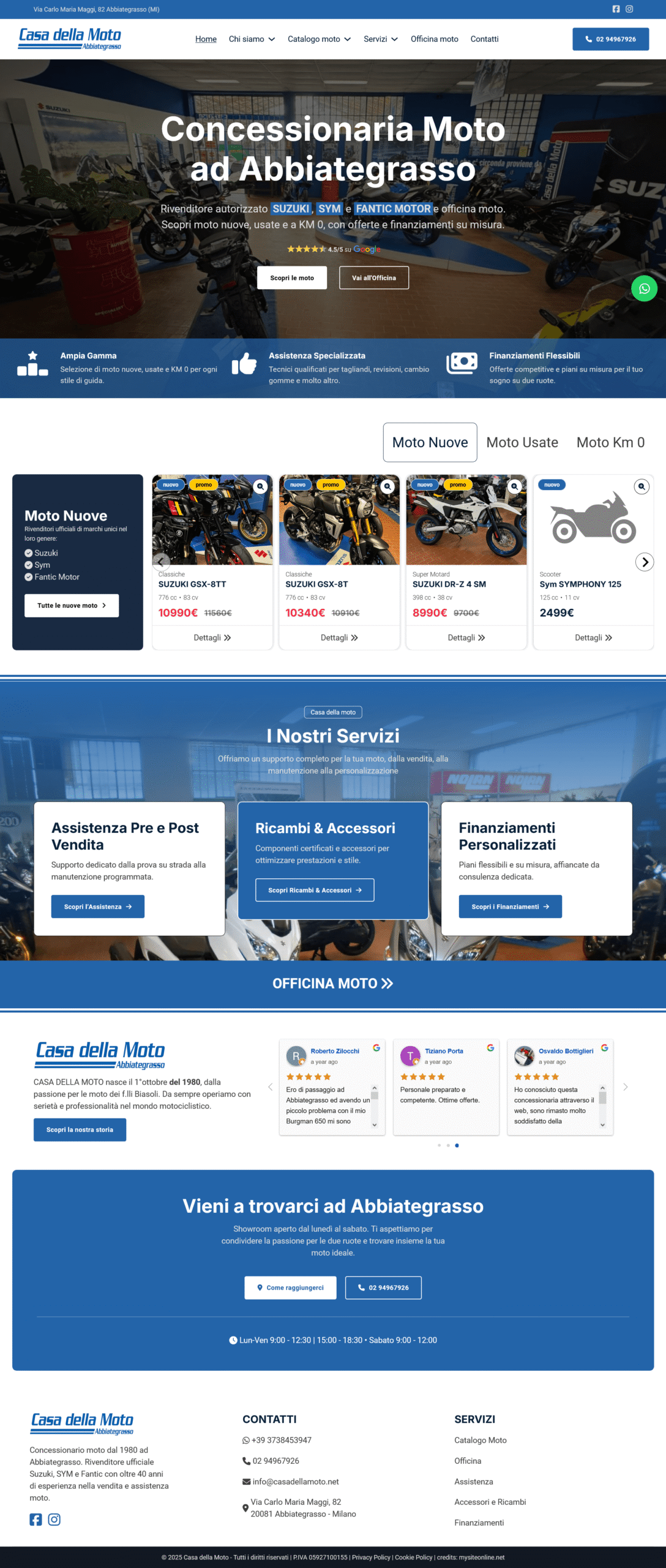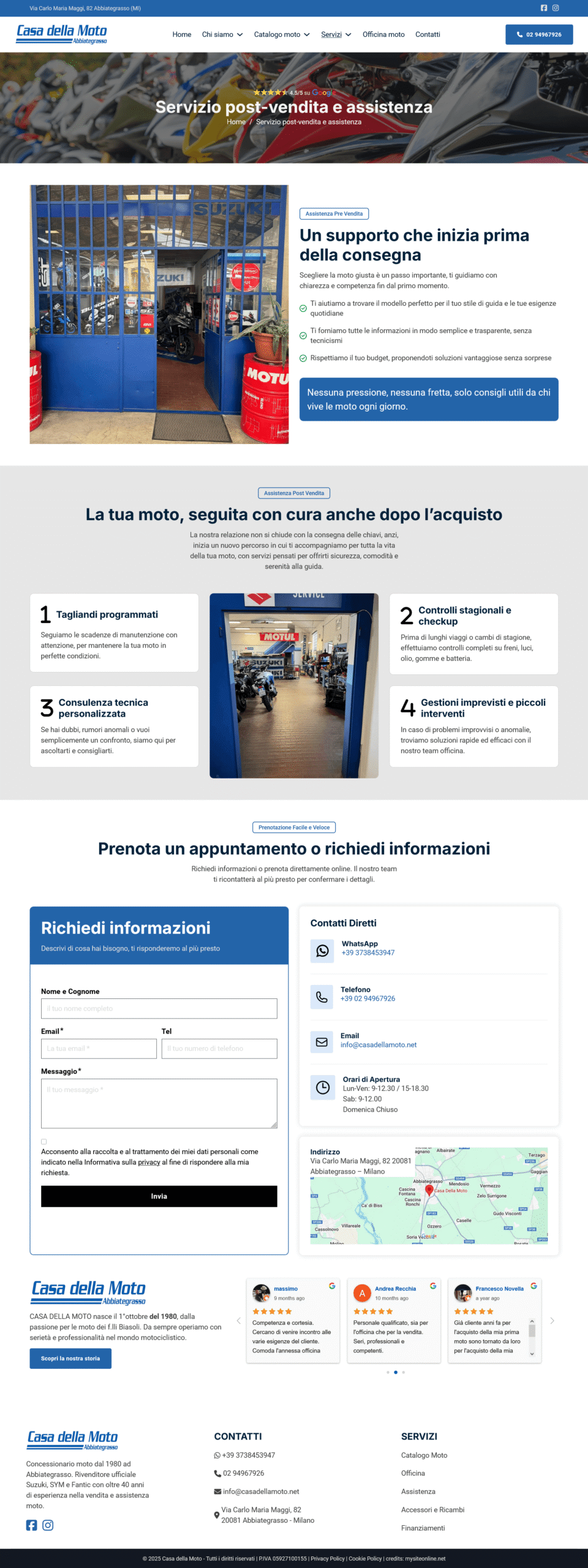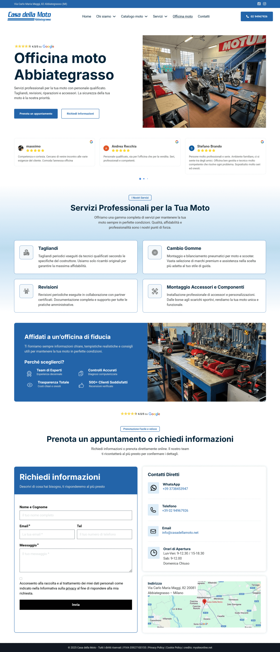 Sono state integrate riprove sociali tramite testimonianze Google e messaggi di fiducia su garanzie, officina e finanziamenti su misura. Implementate best practice SEO on-page e performance per migliorare visibilità locale.