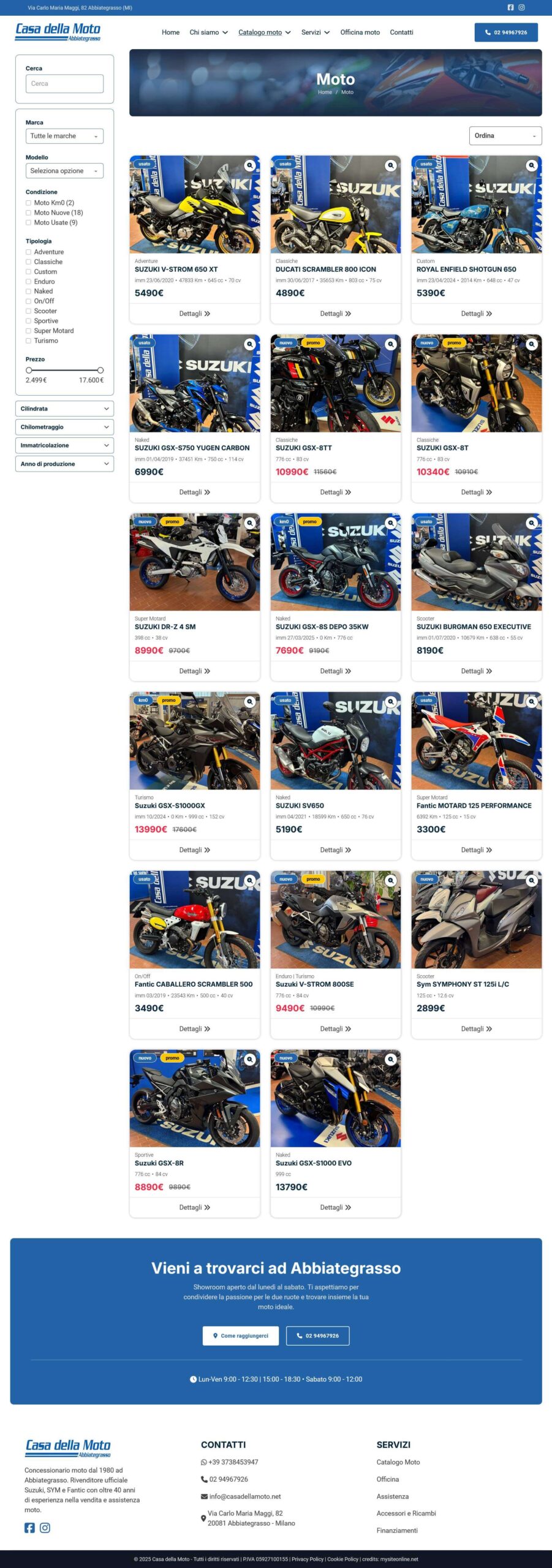 Il sito precedente non supportava più le esigenze di vendita e gestione: layout disallineato, navigazione poco intuitiva e backend obsoleto rallentavano sia gli utenti sia il team interno. Ne derivavano opportunità perse, lead non tracciati e difficoltà nel pubblicare rapidamente nuove moto, usate e KM 0.